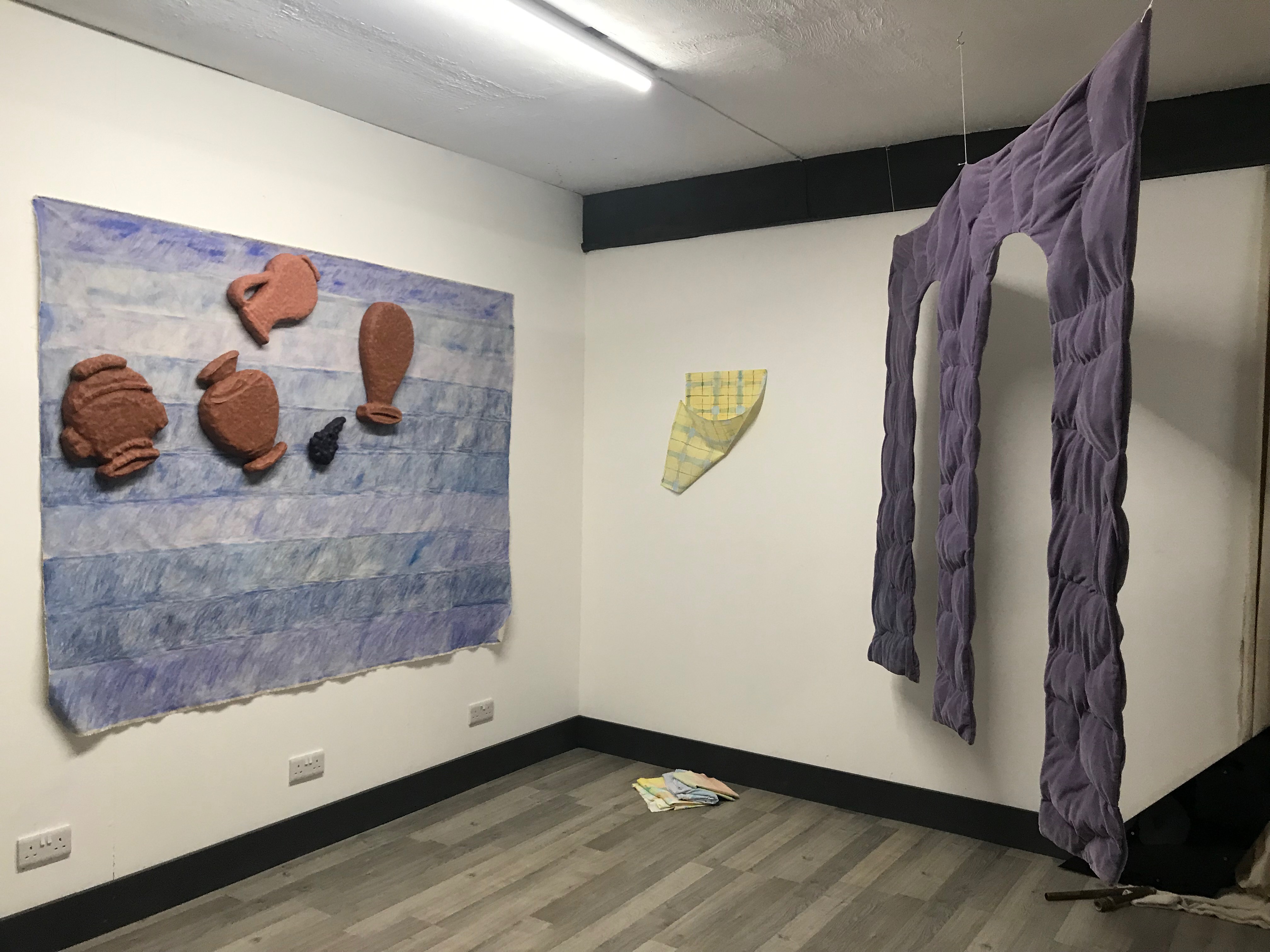 My contributions include dyed textiles that served as a form of painting, as well as soft sculptures featuring motifs taken from plaid patterns, architectural forms, bridges, arches, body parts, and abstract shapes. They physically and metaphorically linked and interacted with the other works within the space, exploring ideas around meeting points and edges. These overlapping objects are designed to act as props, implying the potential to be activated.